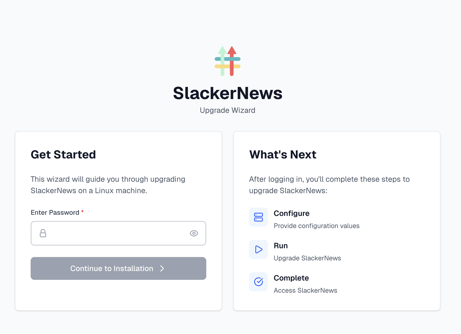 8. Log in to the upgrade wizard using the existing password for the Admin Console.