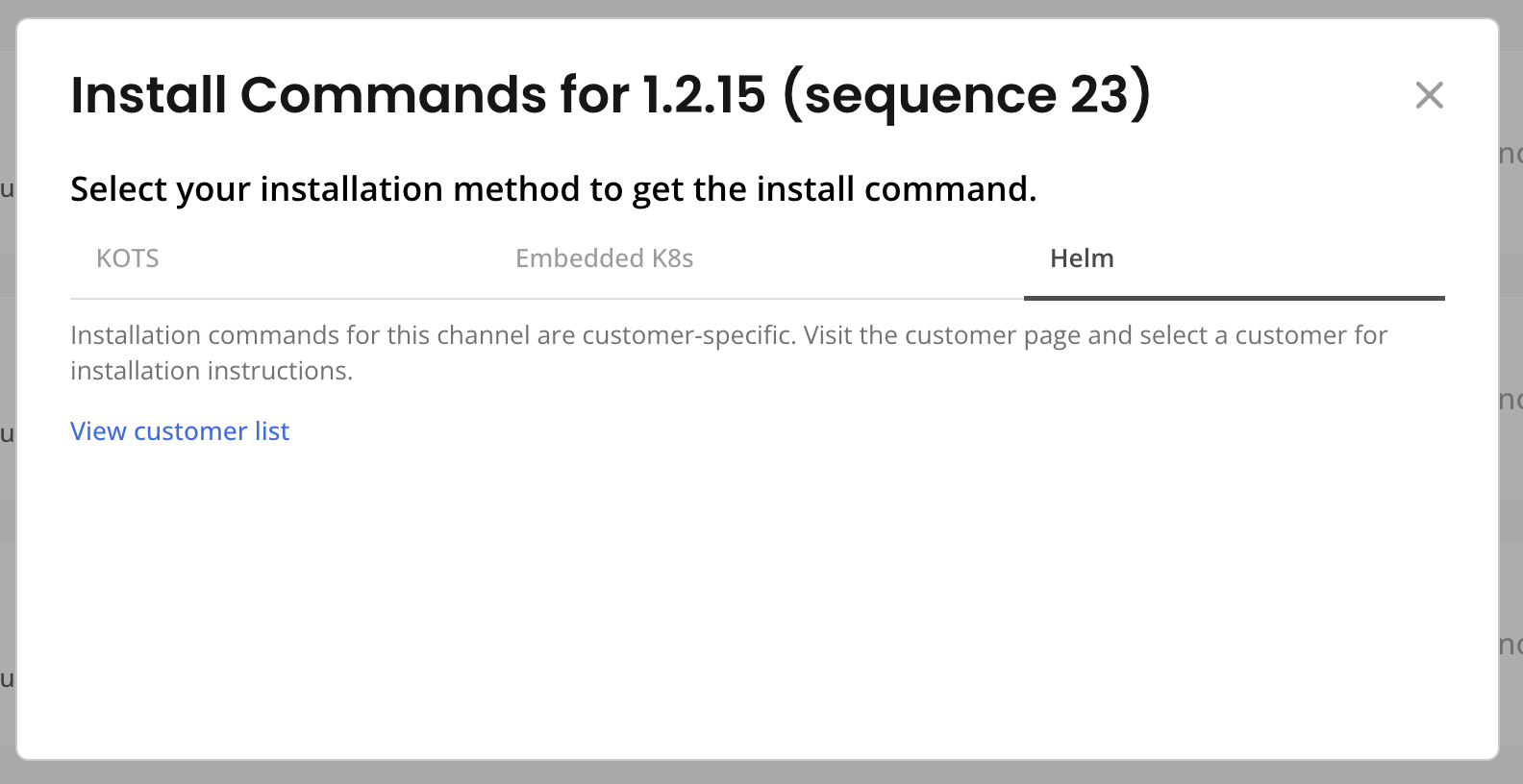 noteThe Helm installation instructions are customer-specific. Click View customer list to navigate to the page for the target customer. For more information, see Get Customer-Specific Installation Instructions for Helm or Embedded Cluster below.